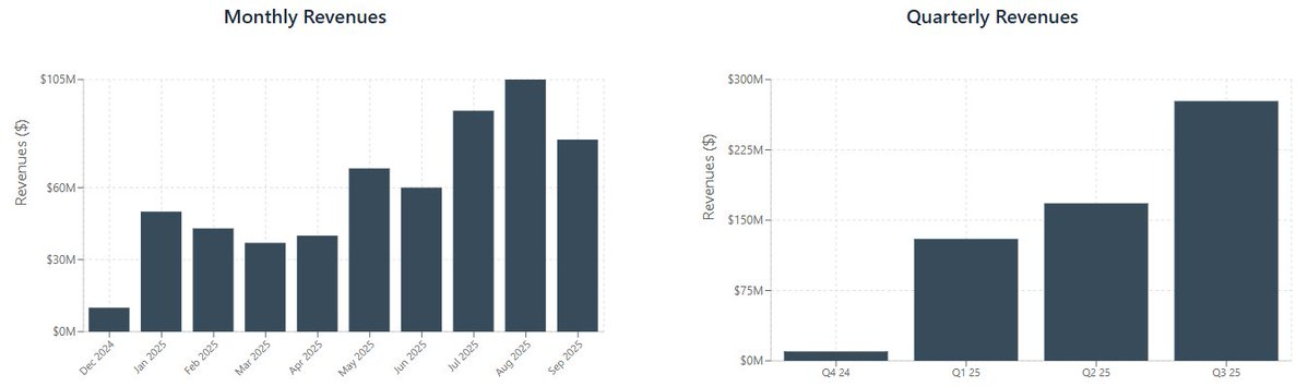 Hyperliquid 2025 年第三季度年化收入与核心贡献者浮动增长一年期分析