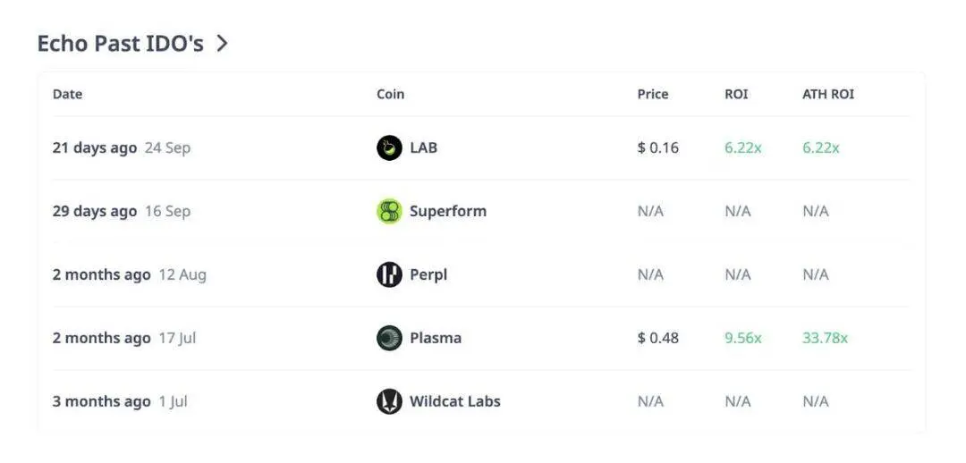 Echo 最亮眼的案例是 Plasma.今年 7 月,该项目采用时间加权金库模式,以 0.05 美元的价格发售 10% 代币,吸引了超 5000 万美元的承诺资金。Plasma 的历史最高回报率(ROI)达 33.78 倍,成为年度表现最佳的 ICO 项目之一。紧随其后的 LAB,上市时回报率也达 6.22 倍。