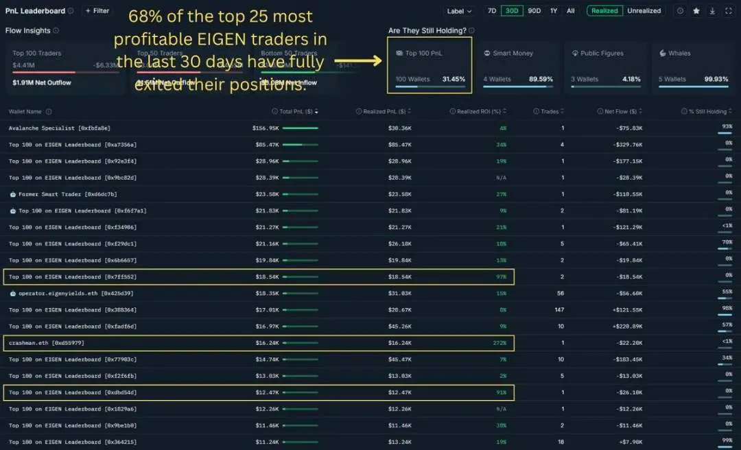 首先引人注目的是:过去 30 天内,$EIGEN 最赚钱的前 25 名交易者中,有 68% 已经完全清仓。他们不是部分获利了结,而是彻底退出。