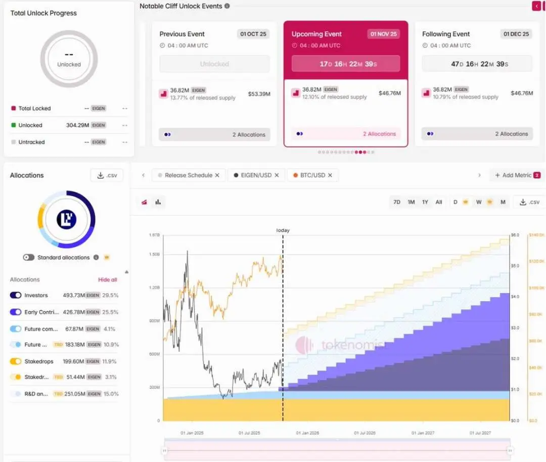 2025 年 10 月 1 日,首批 3682 万枚 $EIGEN 解锁。而从 2025 年 11 月 1 日开始,每月将解锁 3682 万枚,持续约 23 个月,直至 2027 年 9 月。