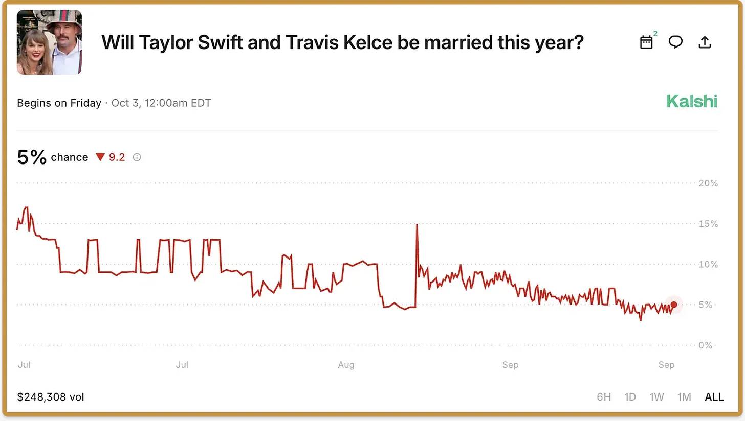 一个很好的例子是Kalshi平台上的一个流行文化问题合约:“泰勒·斯威夫特和特拉维斯·凯尔斯会在2025年结婚吗?”如果你查看图表,你会发现两件重要的事情发生在8月26日,当斯威夫特和凯尔斯在Instagram上宣布订婚时。首先是赔率的激增;其次是随着人们开始关注合约,流动性的大幅增加。虽然无论如何都会出现一定程度的流动性激增,但毫无疑问,这些在关键时刻分享的截图构成了合约本身的病毒式传播,并成为吸引人们下注的入口。这种“打破第四面墙”的现象,使得更广泛的观众突然意识到这个meme(或更准确地说,意识到关注这个合约的理由),为未来的故事增添了一个有趣的新元元素。