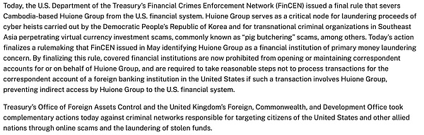 据美国财政部披露,仅通过汇旺网络,至少识别到约 40 亿美元的不法资金在 2021 年 8 月至 2025 年 1 月期间被清洗,其中包含来自朝鲜相关网络盗窃、加密投资诈骗及其他网罪的虚拟资产流入。财政部在对太子集团跨国犯罪组织的同步制裁通报中,强调全面切断汇旺集团与美国金融体系的连接,受监管金融机构现在被禁止直接或代表汇旺集团开设维持代理账户,并且必须采取合理措施,在涉及汇旺集团的交易中,不得处理美国外国银行机构的代理账户交易,以防止汇旺集团间接访问美国金融体系。