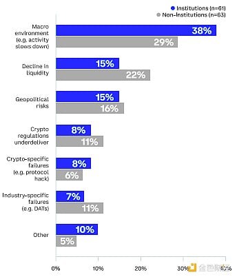 3、无论是机构投资者(38%)还是非机构投资者(29%),均将宏观环境视为未来3-6个月加密货币市场面临的最大潜在风险。