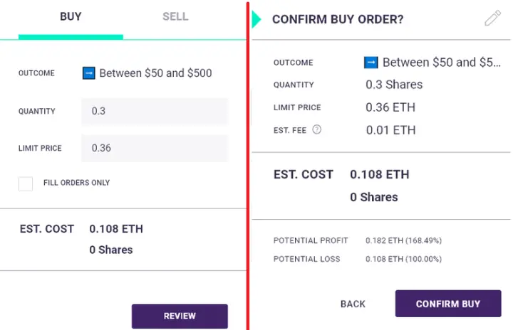 以上文交易市场界面的第二个市场为例,该市场下注的主题是在(2019 年)4 月结束之前 ETH 的价格,三个选项分别为小于 50 美元;50 至 500 美元之间;大于 500 美元。若我们选择第二个选项进行下注,你会看到这样的页面: