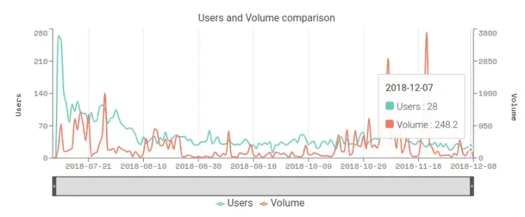 据 DappRadar 数据,Augur 刚上线时 DAU 巅峰达 265 人,但 8 月 8 日这个数字下降到了 37,到了年底日活用户仅有不到 30 人。截止 2018 年 12 月 11 日,Augur 上共创建了 1635 个市场,11825 个订单,成交的订单共计 6331 笔。在 2018 年年底美国中期选举期间,曾单日成交超 200 笔订单。这些现在看来微不足道的数字,在当年已经算是不错的成绩了。
