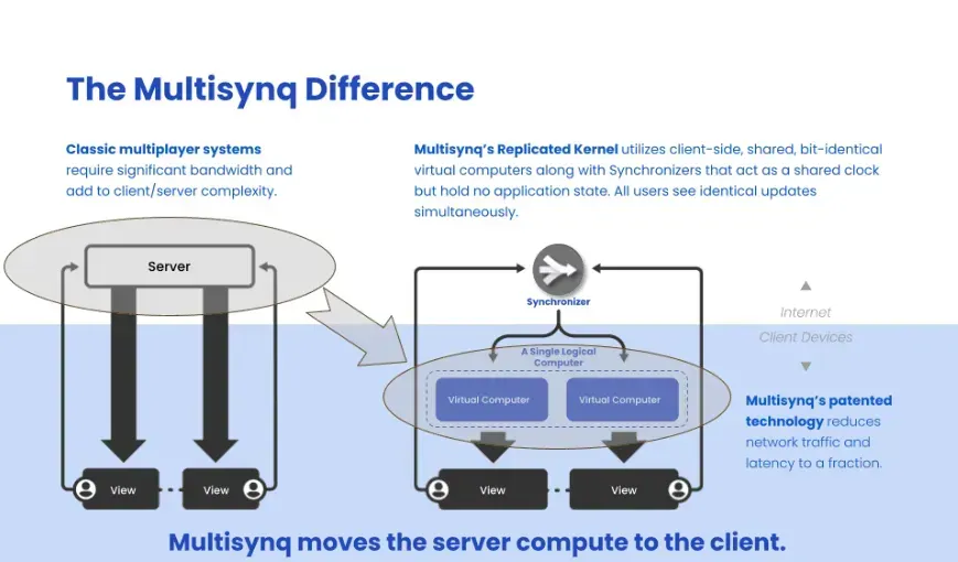 Multisynq 通过消除以服务器为中心的结构解决了这一问题。相反,每个用户的设备本地执行应用逻辑,而 Multisynq 网络中的同步节点负责协调。同步节点不存储数据,无法读取加密消息的内容,仅负责管理同步。