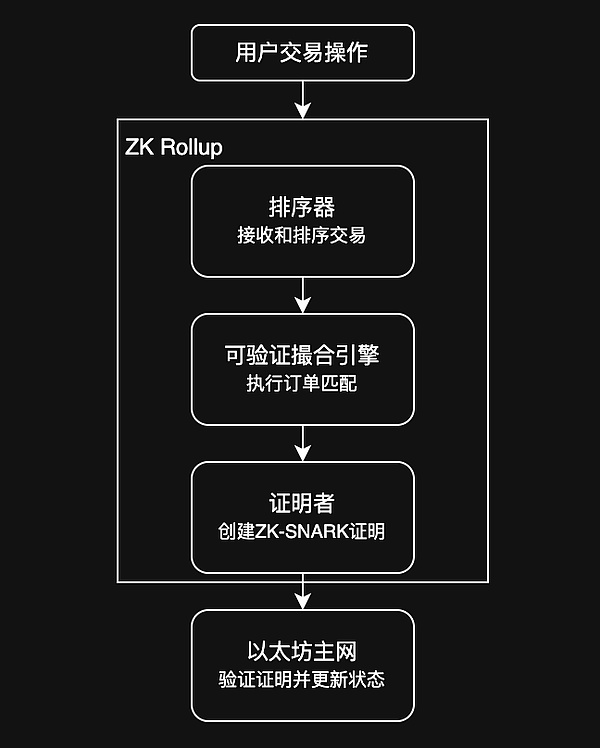 证明者(Prover):将撮合引擎的操作生成为一个简洁的ZK-SNARK证明,用于后续验证撮合执行和状态转换的正确性。