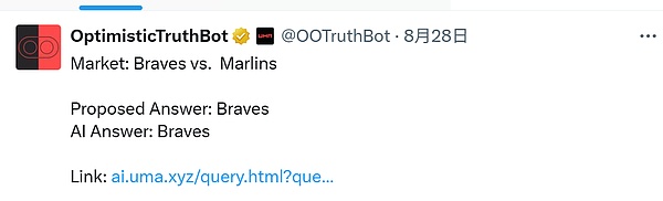 UMA目前也在探索新的颠覆式架构,其正在与 EigenLayer 合作,研究并有探索利用 Eigenlayer 的质押系统开发下一代预言机,同时其也在 AI 方面做一些新的尝试,Optimistic Truth Bot 是一个预测市场中的提案者代理。它监听 Polymarket 的问题,7/24 地第一时间提出问题的最有可能的答案并等待挑战,大幅减少结算时间。可以通过 @OOTruthBot 推特帐号找到看到具体市场。