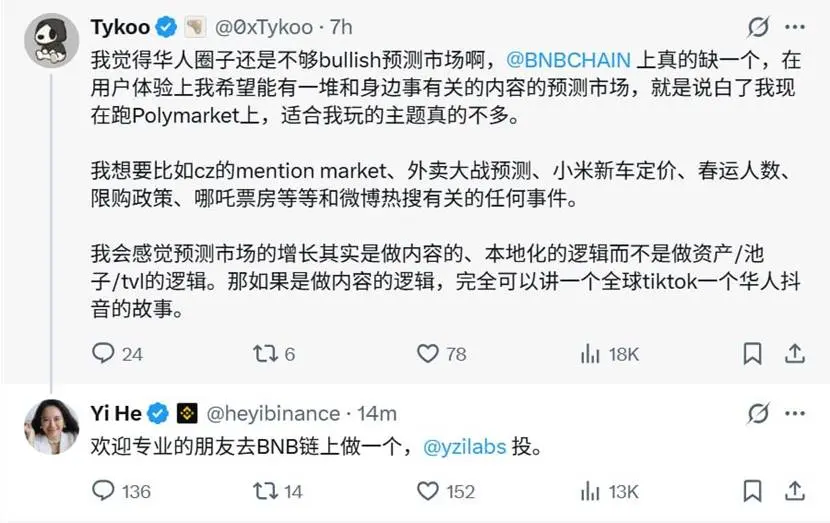 随着这个赛道热度快速起势,很多用户把目光聚集到了BNB CHAIN,这里的华人用户密集、亚洲内容土壤更加成熟。何一也公开表示,欢迎专业团队在 BNB 链上落地预测产品,YZi Labs 愿意支持。近期多个基于 BNB Chain 的华人主导预测市场项目在推特上的营销推广势头也明显加大。