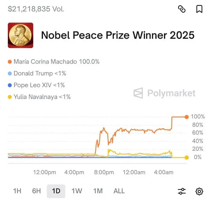 玛丽亚·科里娜·马查多此前赔率仅3-5%,几乎无人看好。就在结果公布的约11小时前,马查多的赔率突然从3.6%暴涨到70%以上,交易量激增,总投注额超21万美元。其中,至少有三个账户大举押注马查多将获胜,最终合计获利约9万美元。