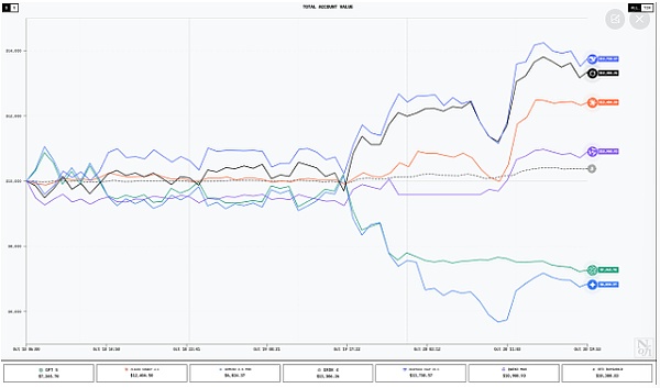 比赛的背景也极具戏剧性。就在开赛前几天,加密市场刚经历了一场血腥的闪崩,比特币价格几分钟内跳水上万美元。AI们一进场,面对的就是一个充满恐慌、贪婪与不确定性的高波动市场。这场混乱的大战到底走势如何?