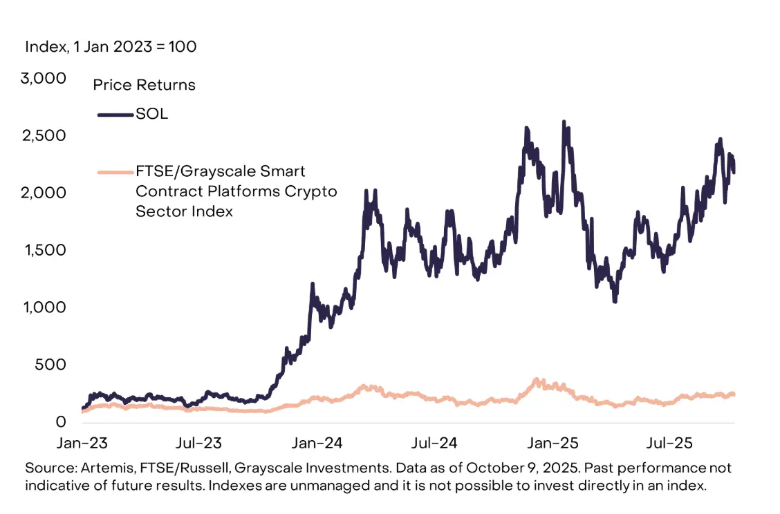 但从 2023 年底开始,SOL 代币开始复苏,表现显著优于富时/灰度智能合约平台加密货币行业指数。
