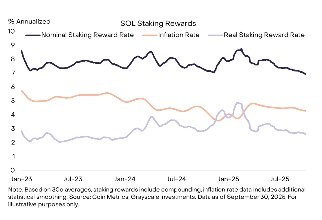 目前,SOL 代币的供应量每年以约 4% 至 4.5% 的速度增长,在其他条件不变的情况下,这可以被视为代币持有者价值稀释的原因。根据网络状况,SOL 质押者可以获得约 7% 的名义回报率,但经通胀调整后的获得的「实际」回报率约为 2.5% 至 3%。目前,约有三分之二的未偿还 SOL 代币已被质押。