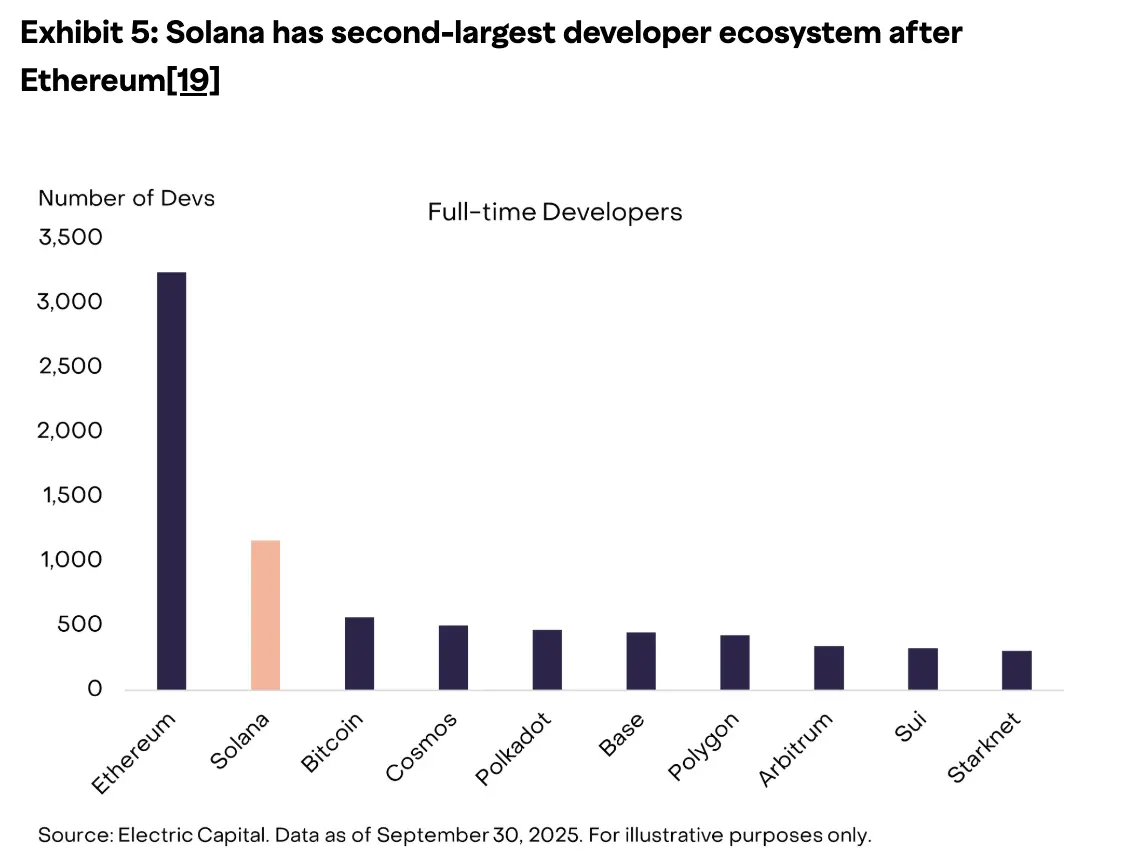 目前,有超过 1,000 名全职开发人员致力于 Solana 和 SVM 的应用程序,并且在过去两年中,专注于 Solana 的开发人员数量的增长速度超过了任何其他智能合约平台(如下图),仅次于以太坊。随着时间的推移,这些人力资本可以为 Solana 持续的创新做出贡献。
