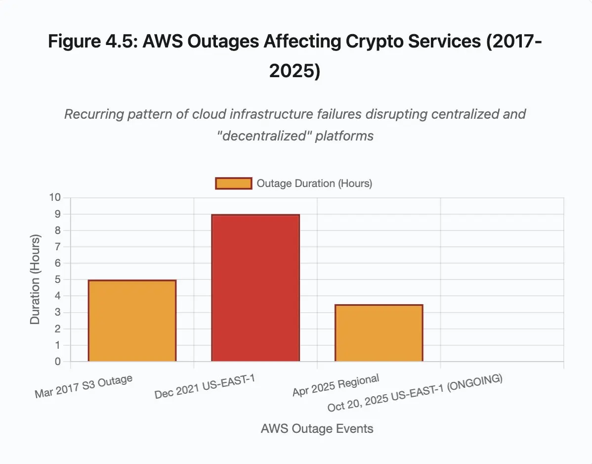这些交易所将关键组件托管在AWS基础设施上。当AWS经历区域性中断时,多个主要交易所和服务会同时变得不可用。在中断期间——恰恰是市场波动可能需要立即采取行动的时候——用户无法访问资金、执行交易或修改头寸。