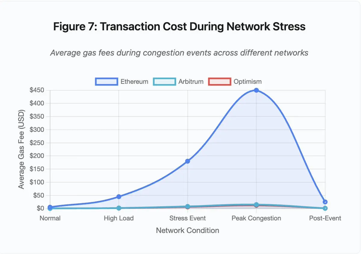 Layer 2解决方案试图通过将计算移至链下,同时通过定期结算继承以太坊的安全性来解决这个问题。Optimism、Arbitrum和其他Rollups在链下处理数千笔交易,然后将压缩后的证明提交给以太坊。这种架构在正常操作中成功降低了单笔交易的成本。