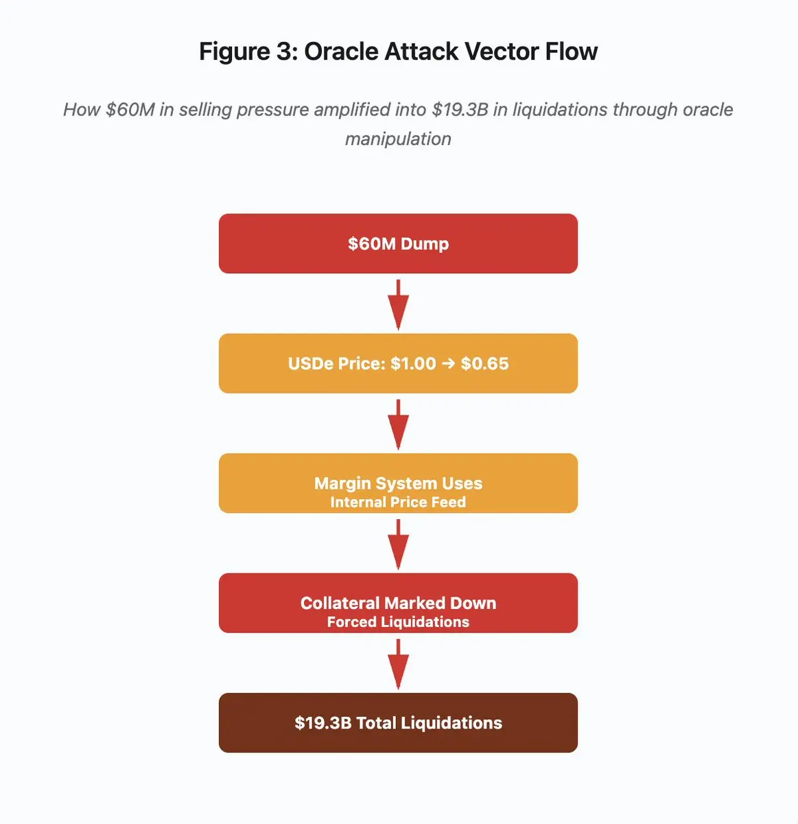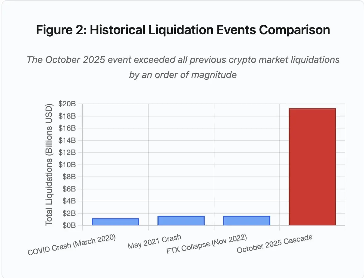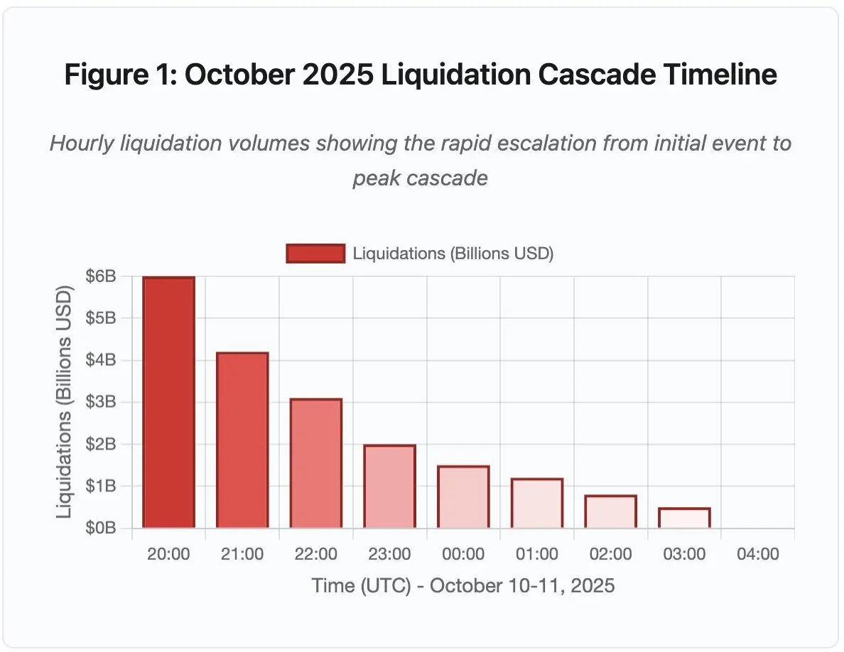 这些清算迫使更多卖单进入同一个缺乏流动性的市场,进一步压低了价格。保证金系统观察到这些更低的价格,并减记了更多的头寸。这个反馈循环将6000万美元的卖压放大了322倍,最终导致了193亿美元的强制清算。