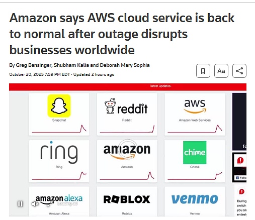 这次事件起因于美国东部时间10月20日凌晨3点(北京时间下午3点),亚马逊云计算部门(AWS)率先在位于弗吉尼亚北部的“US-East-1”区域检测到系统异常。这是AWS全球流量最大、依赖度最高的节点之一。