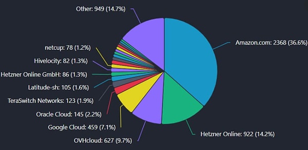 以太坊因为没有矿工支持,节点高度依赖云服务提供商,加上Google Cloud和Azure,总托管节点达68%。