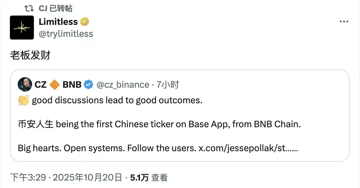 先是先后引发 OKX 的 CEO Star 的讨论。而后又是 Tron 和 Solana 的中文 Ticker 热潮,再到前几日 limitless 创始人公开所谓的「上币条款」,引发两条链和交易平台的对抗,最后 Jesse 一句「在 Base 开启币安人生模式」结束了这场对立。