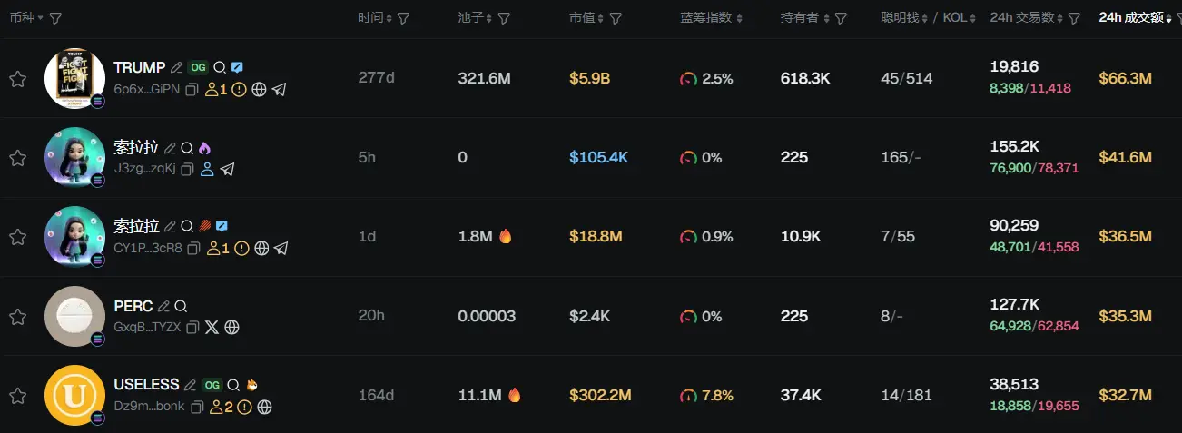 过去 24h Solana 热门代币前五依次为:TRUMP、索拉拉、索拉拉、PERC、USELESS