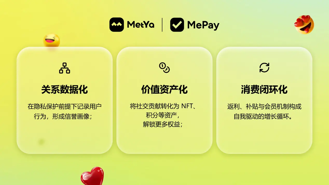 新升级让用户在社交互动中积累的价值无缝转化为可消费的资产,通过高效、透明的支付机制,推动 Web3 应用真正融入日常生活。MePay 不仅延续了 Metya 的核心理念,还通过产品迭代与数据沉淀,进一步强化了平台的竞争力与可持续性。