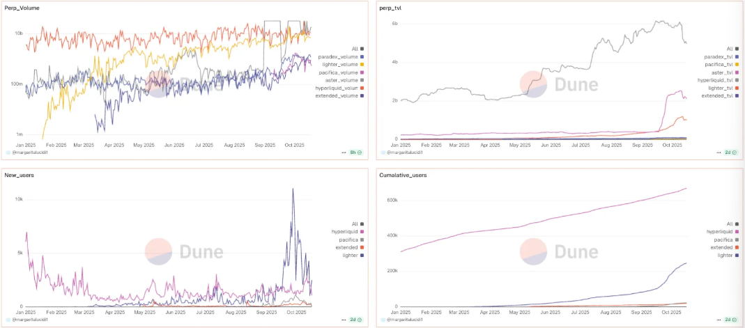 在 10 月初,Hyperliquid 开启了无需许可的上市(HIP-3)。现在,构建者可以通过质押 50 万 HYPE 来上线永续合约市场,同时设有限制,如验证者惩罚和未平仓量上限。此举恰逢去中心化永续合约在与 CEX 的市场份额竞争中创下新高,为「链上正在获胜」的叙事添柴加火。