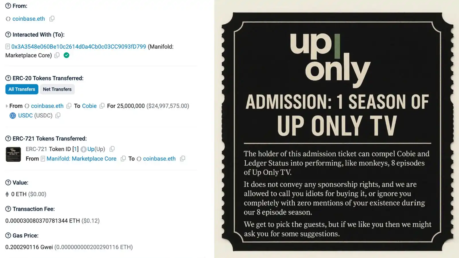 2025 年 10 月 21 日,一个标记为「coinbase.eth」的以太坊钱包,向加密货币 KOL Cobie 转出了 2500 万 USDC,用于购买一个叫做 UpOnly 的 NFT。