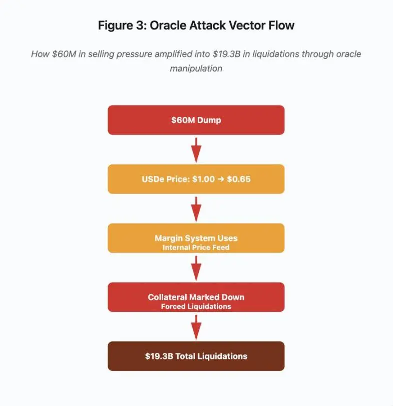 这些清算迫使更多卖单进入同一非流动性市场,进一步压低价格。保证金系统观察到这些更低的价格,并标记了更多头寸的价值,反馈回路将 6000 万美元的抛售压力放大成了 193 亿美元的强制清算。