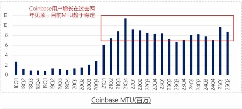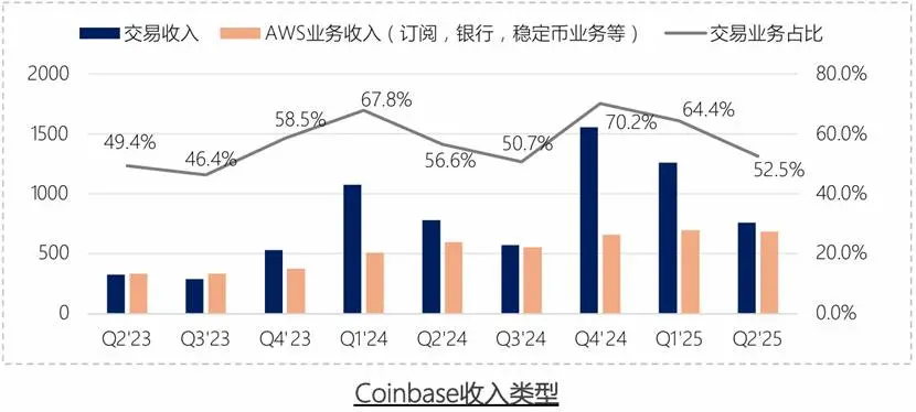 Q2 2025 股东信显示,Coinbase 当季收入 15 亿美元,净收入 14 亿美元,衍生品业务在 2025 Q2 出现放量,但主要是由于费率返利和做市激励,持续性存疑。AWS 化业务仍处早期阶段,尚未完全抵消交易收入的波动。