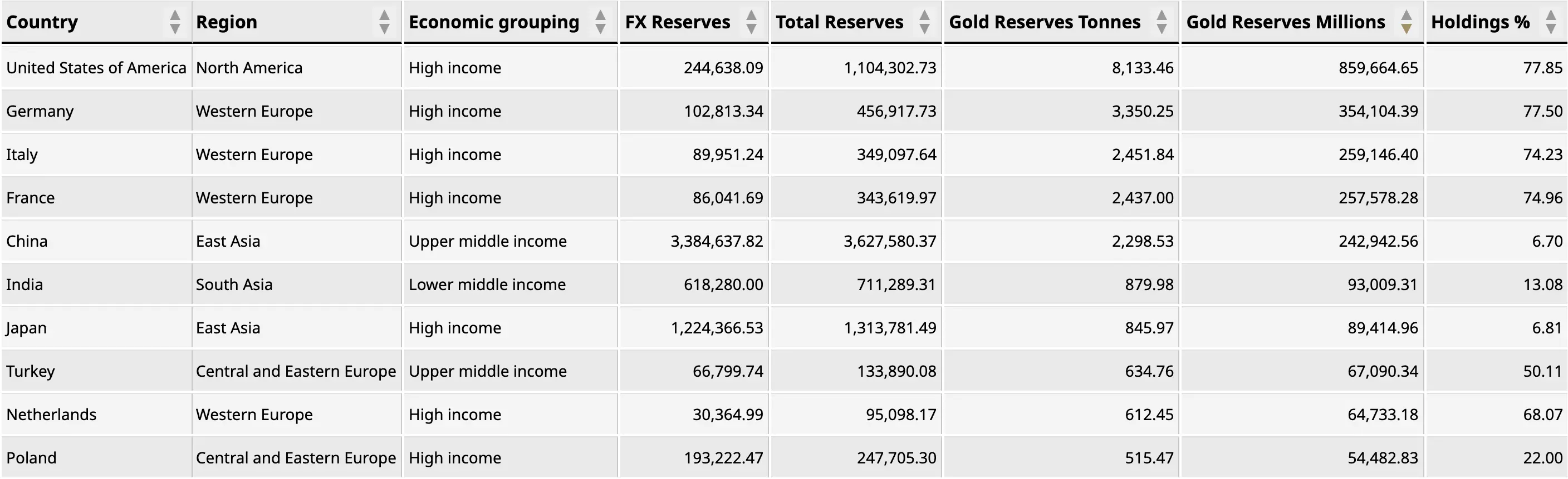 美国 77.85% 的资产储备是黄金,持仓 8133 吨,断崖领先第二名德国的 3350 吨,随后是意大利和法国,分别持有黄金 2452 吨和 2437 吨。