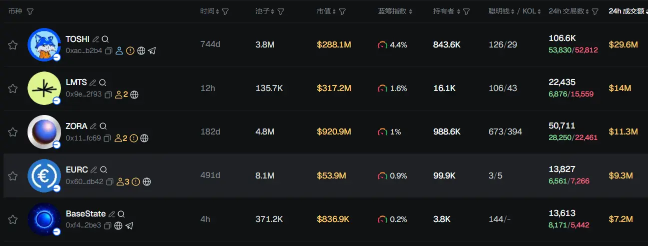过去 24h Base 热门代币前五依次为:TOSHI、LMTS、ZORA、EURC、BaseState