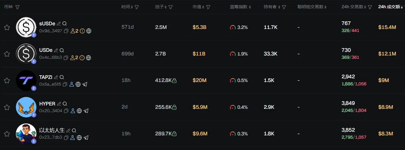 过去 24h ETH 热门代币前五依次为:sUSDe、USDe、TAPZI、HYPER、以太坊人生