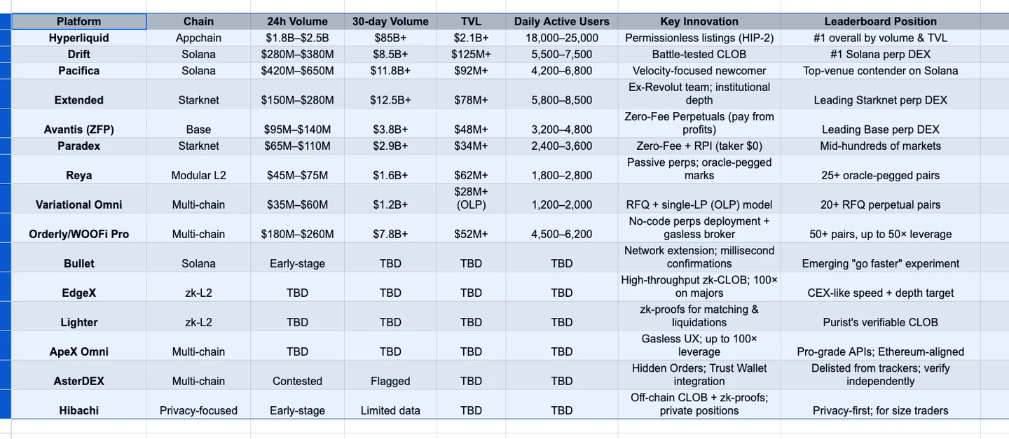 运行一个速度型平台(Hyperliquid / EdgeX / Bullet),一个费用模型对冲平台(Avantis ZFP 或 Paradex RPI),以及一个你信任的链原生选项(Solana 上的 Drift/Pacifica;Starknet 上的 Extended/Paradex)。然后让延迟、证明、有效费用和清算逻辑——根据你的订单量衡量——来决定你在哪里点击开仓。