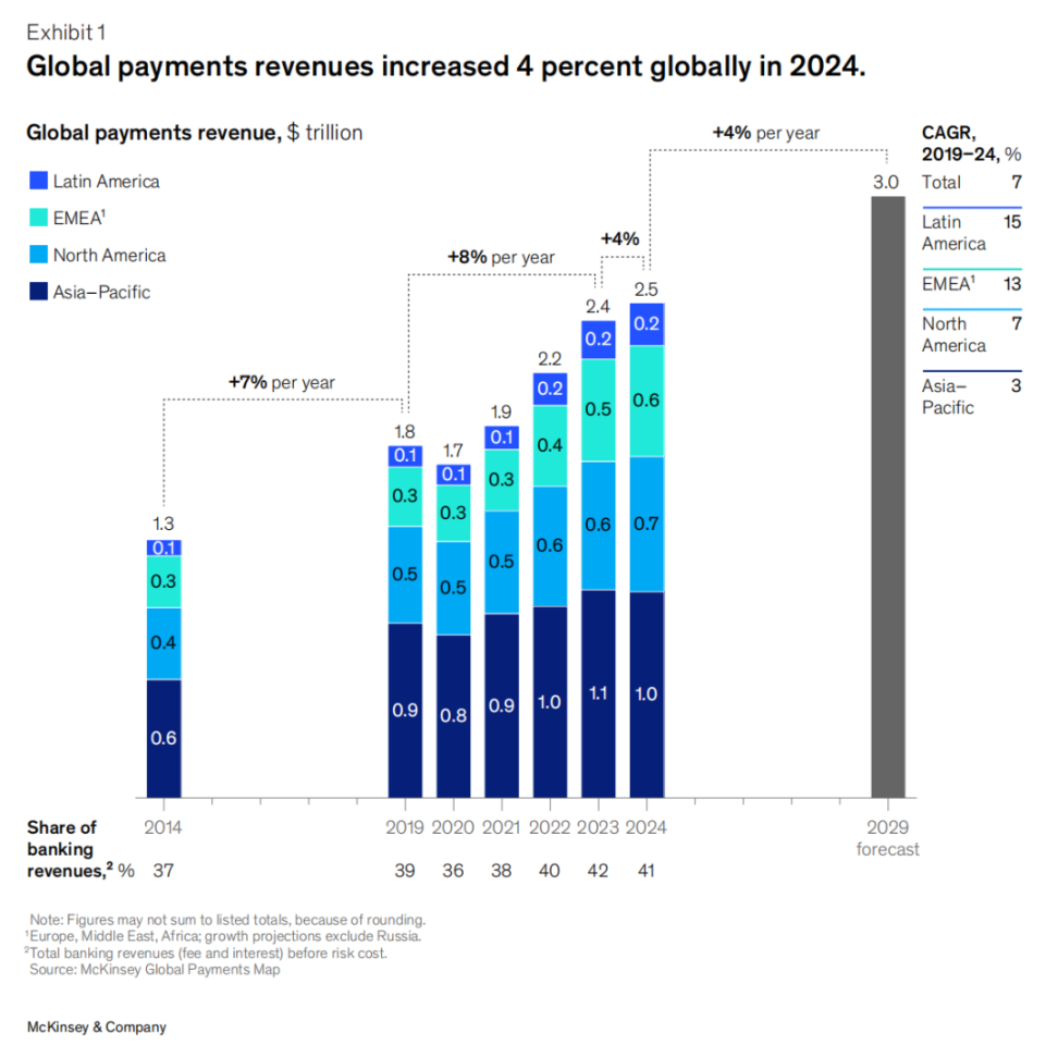 2019 年至 2024 年间,全球支付收入年均增长 7%。受利率走高推动,2024 年利息收入占总收入的 46%。当年增速降至 4%,显著低于 2023 年的 12%。放缓原因包括:利率见顶、宏观经济趋弱、低收益支付方式结构性扩张,以及持续的手续费挤压。