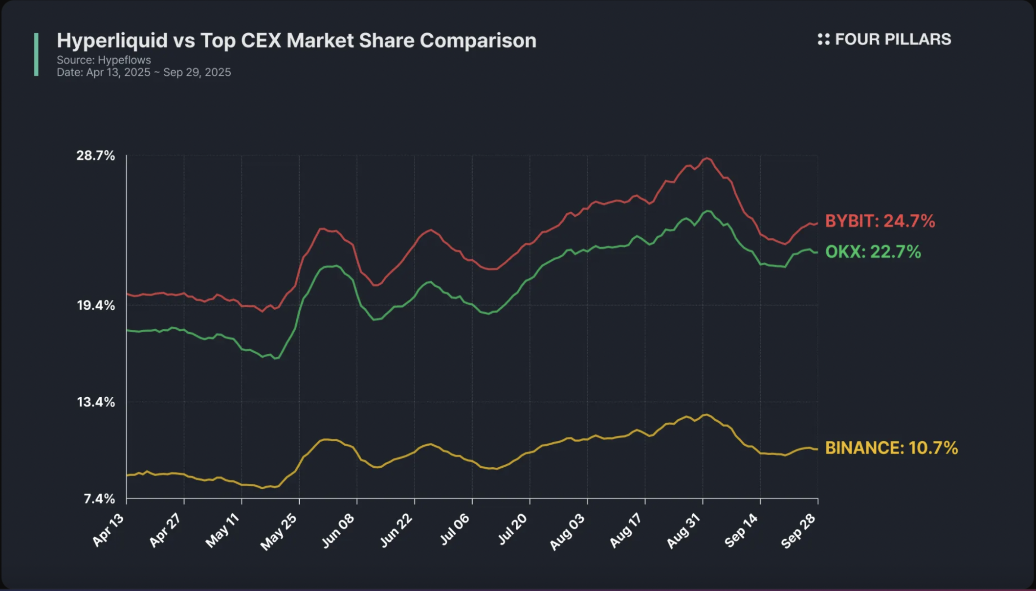 众所周知,Binance 一直以激进的竞争风格著称。许多人认为,它的策略在某种程度上加速了 FTX 的崩溃。如今,Hyperliquid 的交易量已稳定达到 Binance 的 10% 以上,CZ 注意到这一点是顺理成章的。