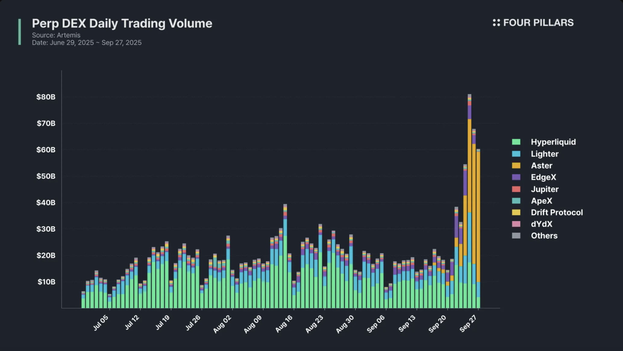 在九月底的某一天,Aster 和 Lighter 的单日交易量分别达到了 428 亿美元和 57 亿美元,双双超过了 Hyperliquid 的约 46 亿美元。其他新晋项目如 EdgeX 也紧随其后,成交额达到 33 亿美元。对于外界观察者而言,这「似乎」意味着 Hyperliquid 已被拉下王座。就在几个月前,它还掌控着整个链上永续合约市场超过 70% 的份额,而如今,它的排名已降至第二甚至第三。