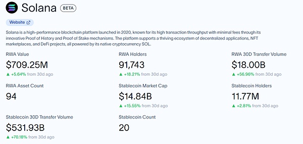 从数据来看,Solana的RWA生态虽然处于早期,但已表现出强劲的增长势头,根据RWA.xyz,当前Solana生态内RWA资产已达94种,总市值达7亿美元。而最近30天,Sol链上的RWA转账金额达到180亿美元,交易量仅次于以太坊。