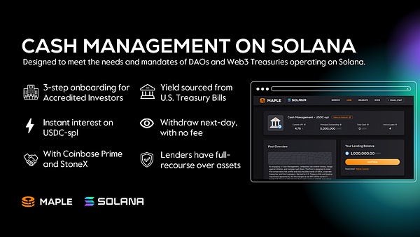 2023年5月,Maple推出了资管方案Maple Cash Management Pool,靠国债收益为用户提供4.8%左右的净APY,可以根据需要自由进出池,而无需支付锁仓或赎回费,成为Solana生态首个国债类RWA。现在产品已被拓展为USDC借贷,但考虑到其在Solana生态的开创性作用, 也记录在本文中。