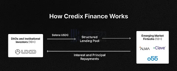 Credix Finance于2021年创立,专注于私人信贷类RWA 。Credix的逻辑比较简单,可视为一个链上与现实之间的借贷中介平台:向链上用户借来USDC,再转换为各国本地货币,贷给各种类型的借款实体,并向链上用户提供借贷收益。