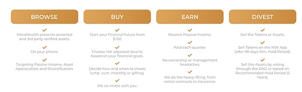 MetaWealth与第三方质量评估机构完成审计和调研后,将合格房产收购并出租,同时将将房产的所有权碎片化,使得用户可以以最低100美元的低门槛参与投资,并根据投资占房产总价的份额分取租金。