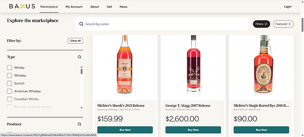 BAXUS将高端酒(如稀有威士忌、葡萄酒)存储在安全的温控库中,每瓶酒通过区块链技术生成一个独特的NFT,作为数字化所有权证书,记录瓶子的来源、认证和交易历史。同时提供一个类似Opensea的市场,允许用户直接交易稀有酒类,支持USDC和信用卡等传统支付方式。