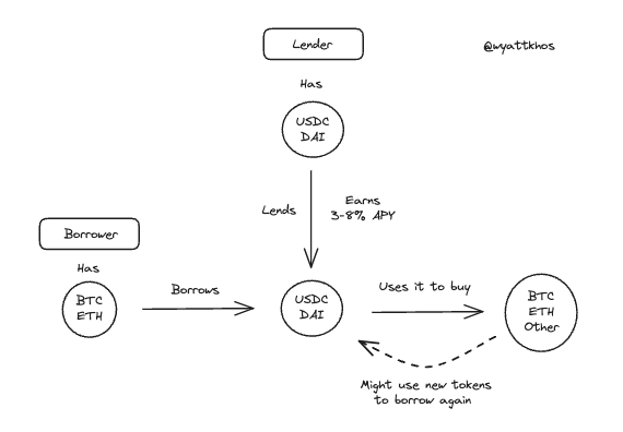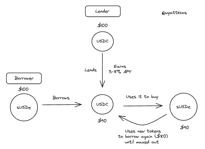 在许多现代借贷市场中,借款人用作抵押品的资产(例如 sUSDe,用于借出 USDC)也可以作为借出的资本,再被另一个用户借用。根据抵押资产的性质,它可能对其他用户有用(如 ETH),也可能无用(如 stETH)。