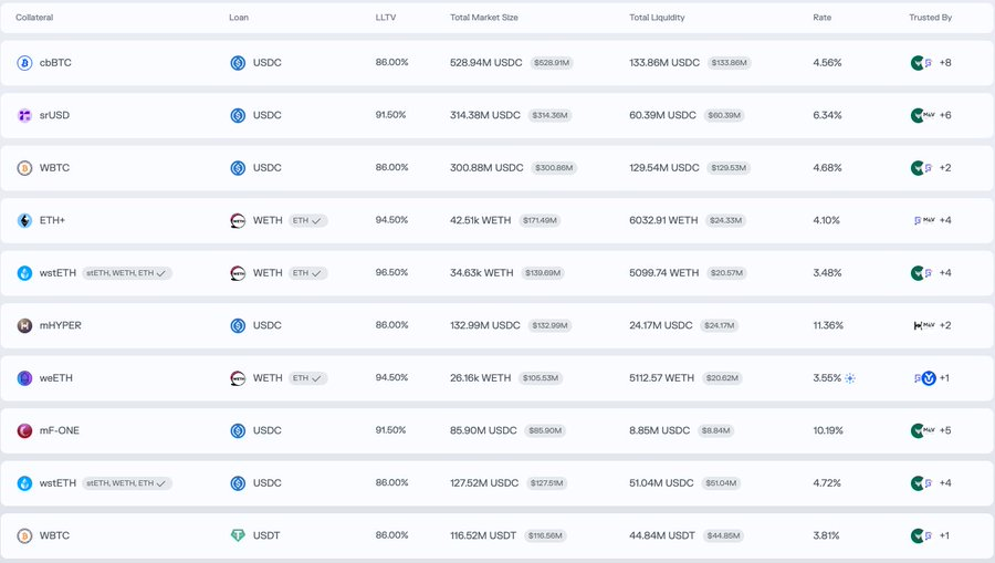 为了了解当前借贷市场的使用情况,我们可以看看 Morpho 上的领先市场。除了 BTC 市场(如 cbBTC 和 WBTC),其主要交易对显示出不同的活动模式,更偏向于优化收益或流动性,而非方向性杠杆操作: