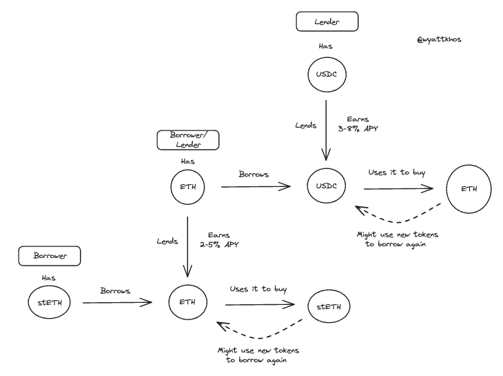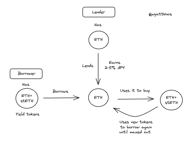 假设用户 1 存入 stETH(质押的 ETH),以借出 ETH 并购买更多的 stETH。这是一个合理且可行的交易,只要用户能够以低于 stETH 奖励的利率借到 ETH。然而,这种情况下,其他用户很可能并不愿意借用用户 1 提供的 stETH。对于借贷协议来说,这笔交易是有意义的,但在本例中,情况就此终结了。