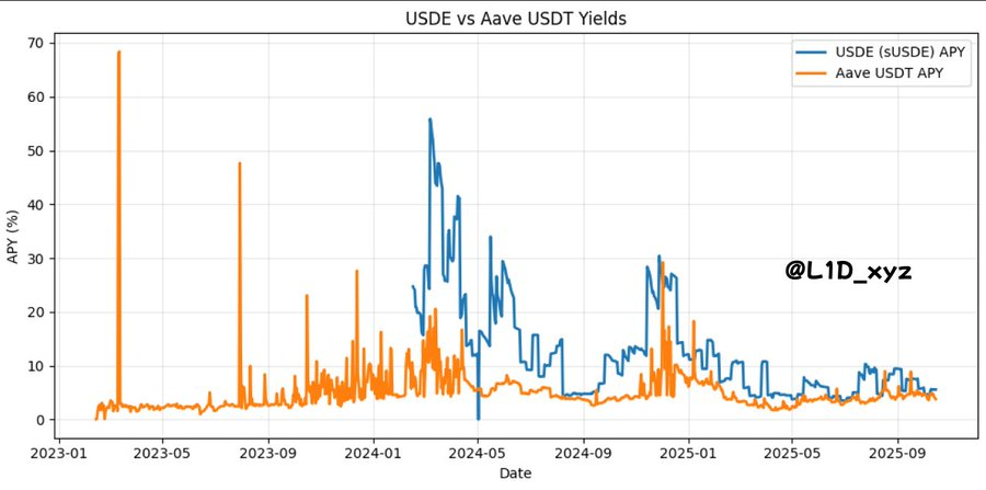 Ethena 的 USDe 成为近期收益循环策略激增的关键驱动力。这种交易现在已经非常普遍,主要依赖于 Aave 和 Pendle,但也可以通过其他收益资产复制。这种策略的可持续性直接取决于基础收益的质量和稳定性。正如 @shaundadevens 在 8 月的一条推文中提到的,这种市场行为有着清晰的描述。