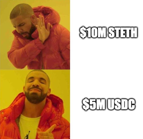 举个例子,如果某协议上有 10 亿美元的 stETH,且贷款价值比(LTV)为 75%,那么这笔资产的构成可能是以下几种情况之一: