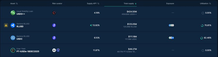例如,在 Euler 上,我们可以看到主要基础稳定币(如 RLUSD、USDC)的利用率非常高,而长尾收益型衍生资产几乎没有借贷活动。
