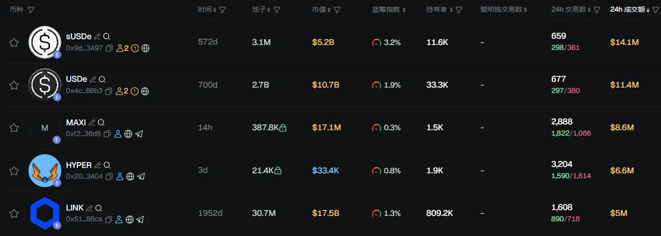 过去 24h ETH 热门代币前五依次为:sUSDe、USDe、MAXI、HYPER、LINK