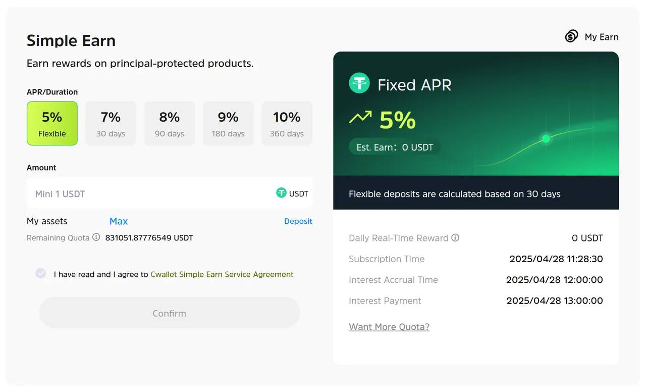 Cwallet Earn 支持活期和定期两种模式,用户只需在功能页面锁定资产即可轻松获取收益,最低 1 U 起投。